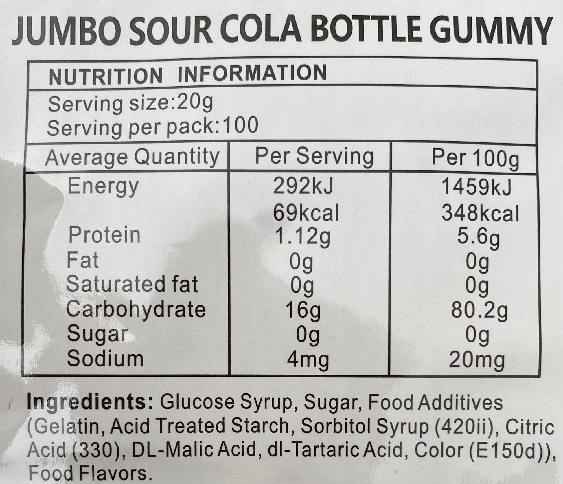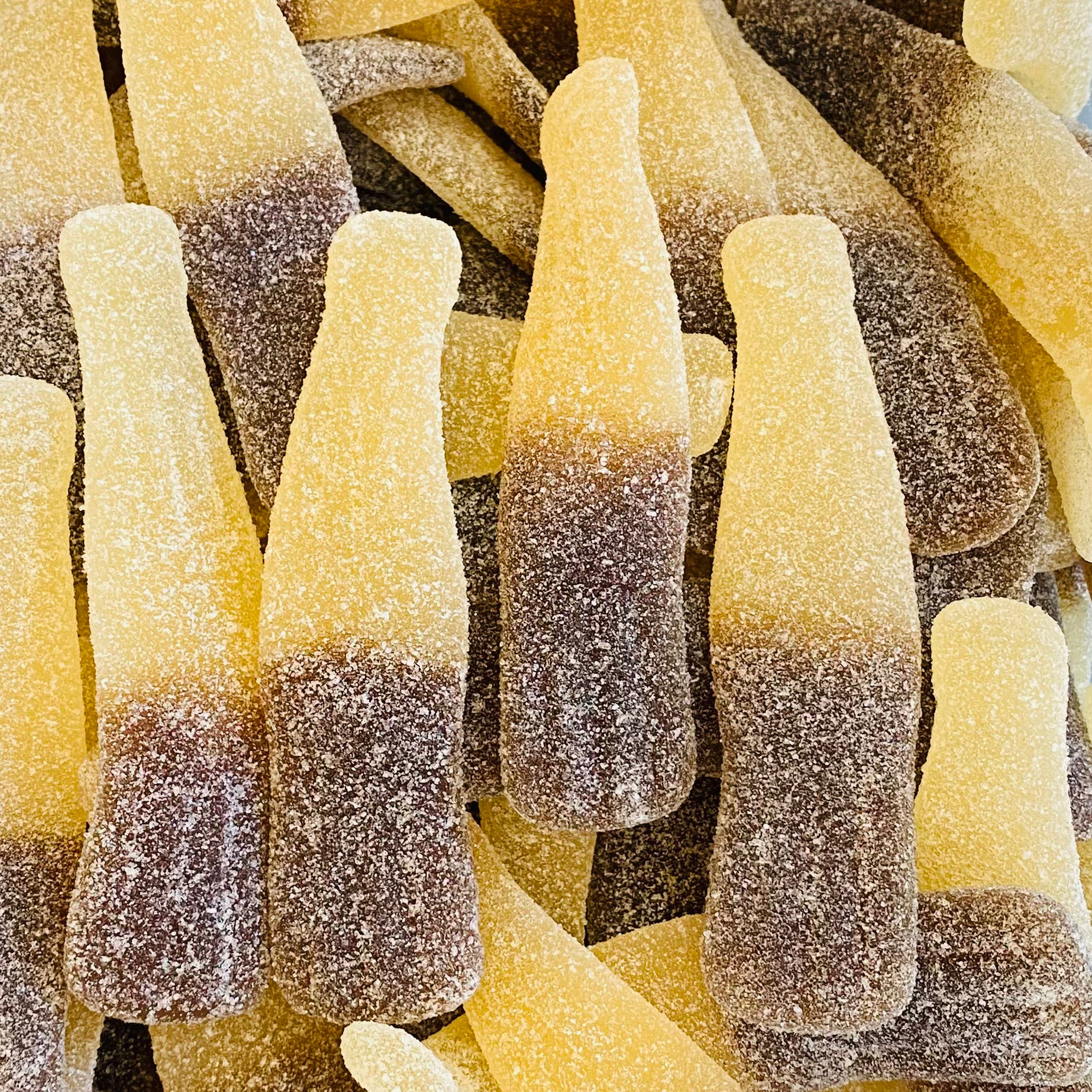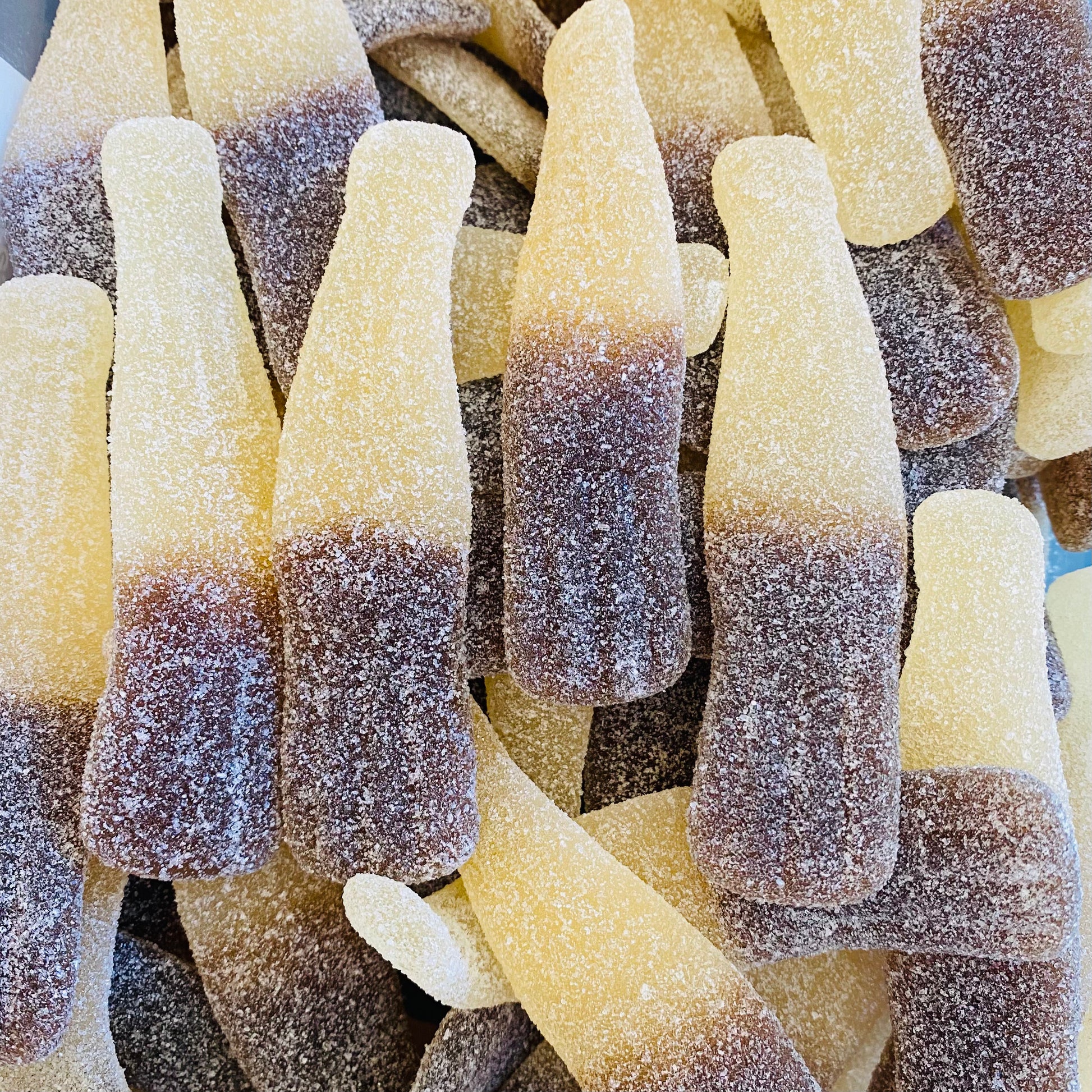 Sour sugar-coated, cola flavoured gummy sweets in the shape of a jumbo bottle. for the cola lovers out there.
