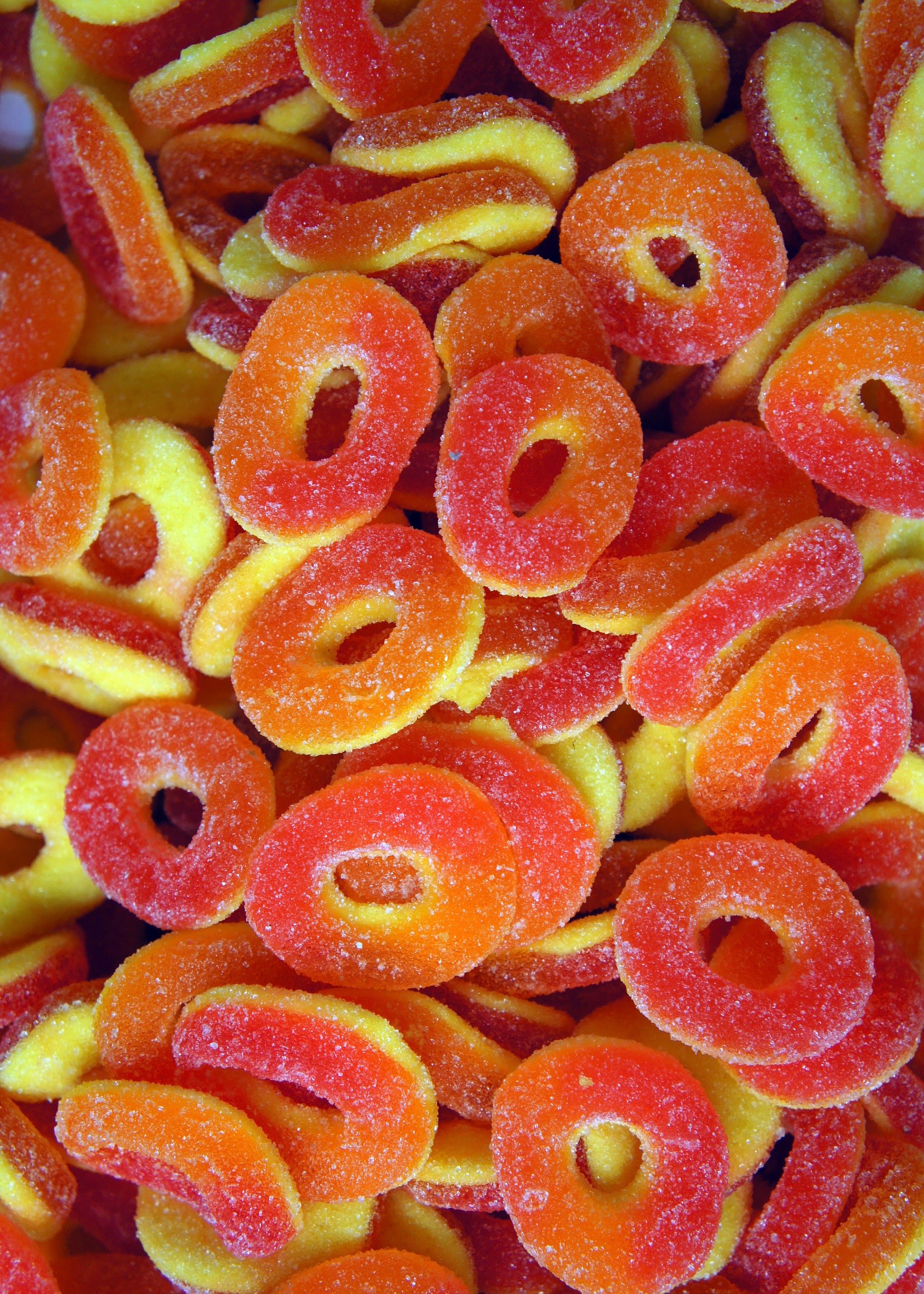 The delicious taste of fruity peaches in a soft chewy ring with a light sugar coating.