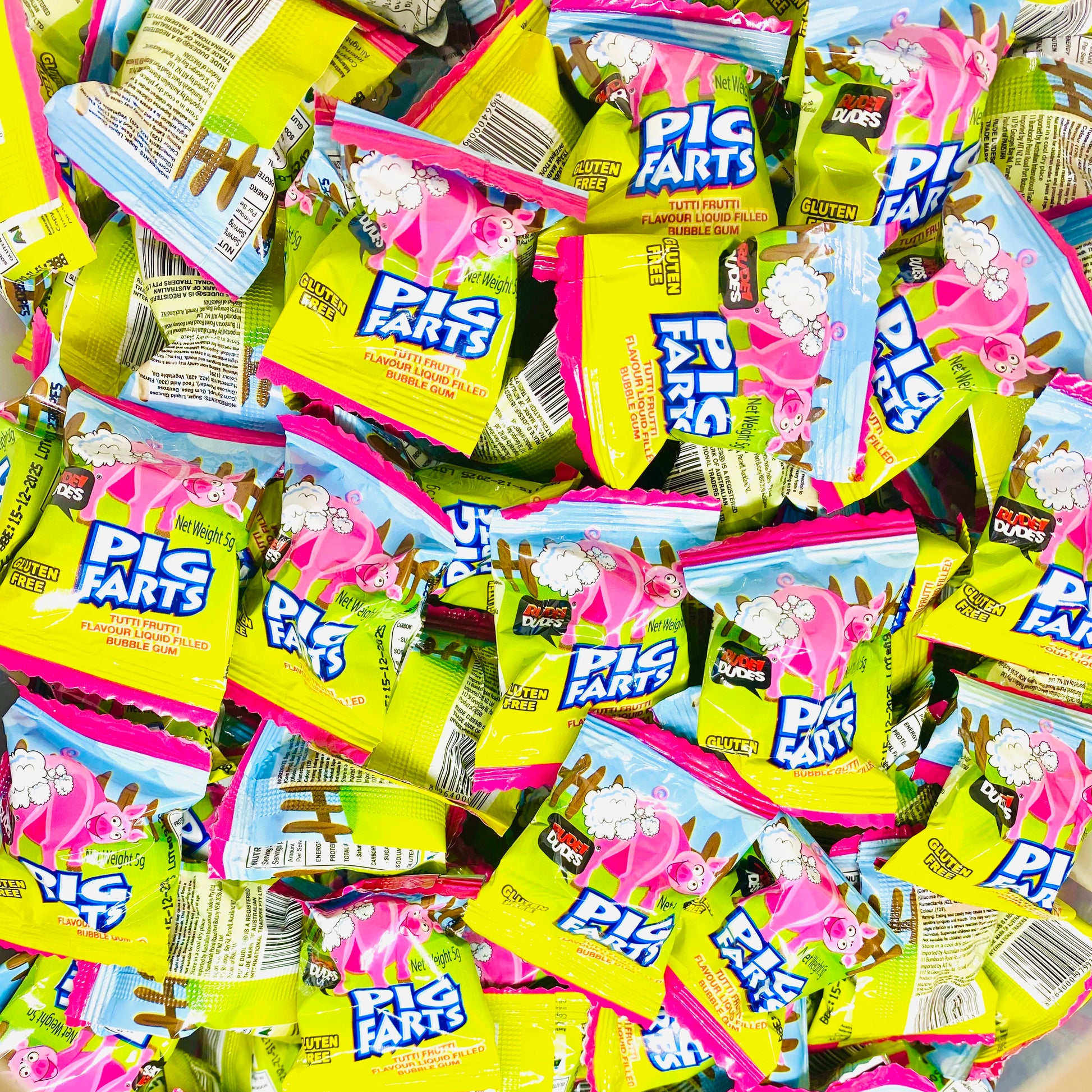Get ready for a burst of cheeky fun with Pig Farts Bubblegum! Each piece is packed with a Tutti Frutti goodness that will make your taste buds dance. Chewy, juicy, and hilariously bold, extra sour flavour, this bubblegum isn’t just candy—it’s a conversation starter. Perfect for kids (and grown-ups who don’t take life too seriously), Pig Farts Bubblegum is guaranteed to bring giggles with every chew.