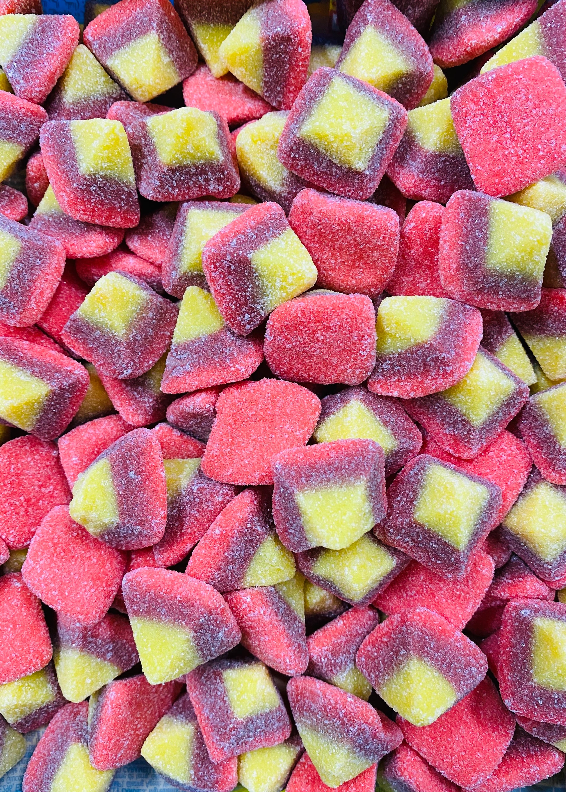 Red and yellow coloured sugared pyramids. It’s a mouthwatering thing.