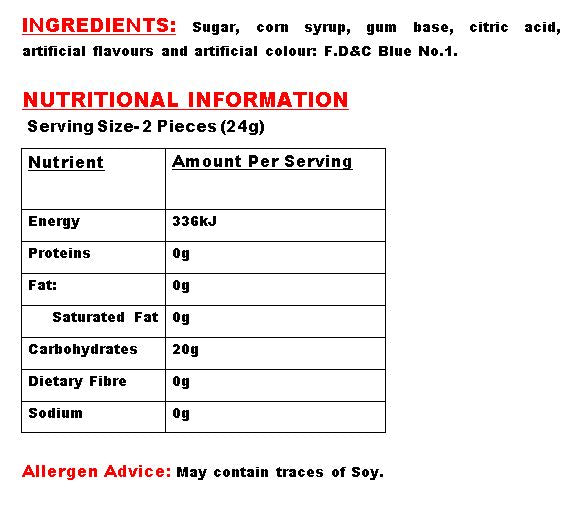 Bubble gum filled blue Lollipop 12g each with chicle filling that colors the tongue. Flavour: blue raspberry.