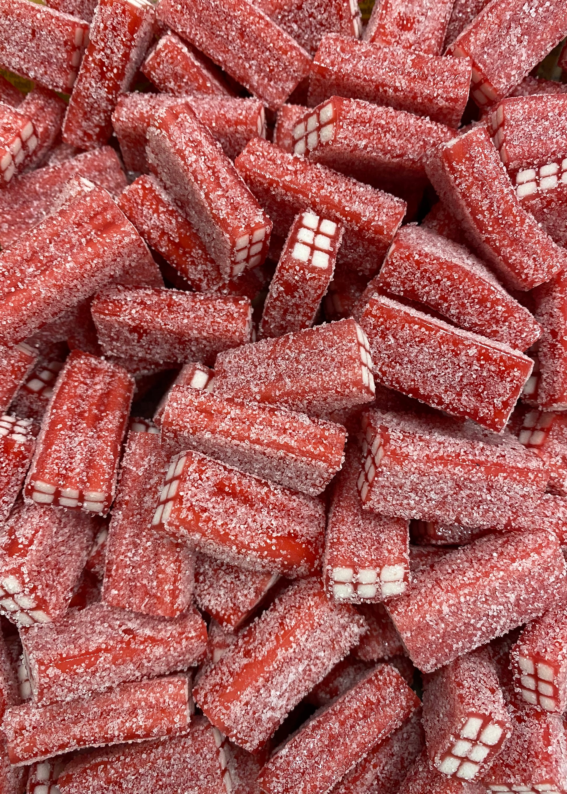 Fizzy Strawberry brick rolled in sugar with sherbet inside.