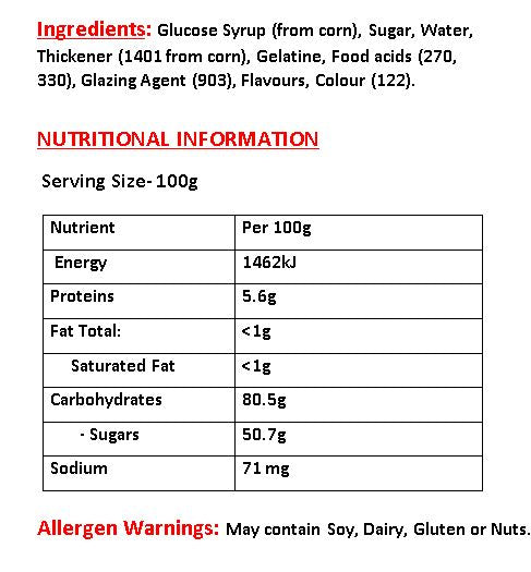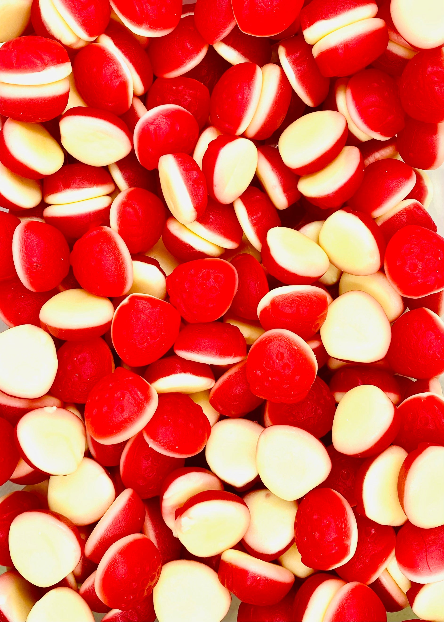 A Strawberry and Cream flavoured gummy in the shape of strawberry with a cream backing.